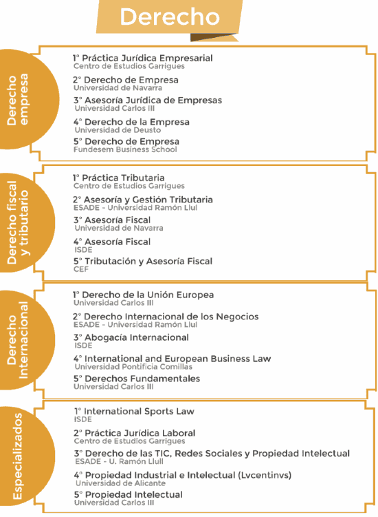 Estudiar un máster en Derecho permite especializarse en una de las muchas áreas que abarca este área. Dejando de un lado el Máster de Acceso a la Abogacía que se necesita para poder ejercer como abogado, el ranking de El Mundo recoge cuatro categorías del Derecho en las que poder estudiar un máster: el mejor programa en los mejores centros.